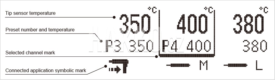 Digitální displej jasně a podrobně zobrazuje informace, jako je nastavená teplota, teplota senzoru hrotu a přednastavené hodnoty. Pozorovací úhel je široký a displej s vysokým jasem poskytuje vysokou viditelnost.
