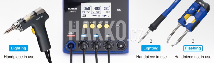 Na jakémkoli portu tříkanálové stanice HAKKO FX-973 lze používat všech devět typů pájecích ruček. Flexibilní možnosti konfigurace umožňují optimální kombinaci a splnění požadavků různých aplikací a vzorků. Standardně je součástí dodávky i odpájecí pistole.